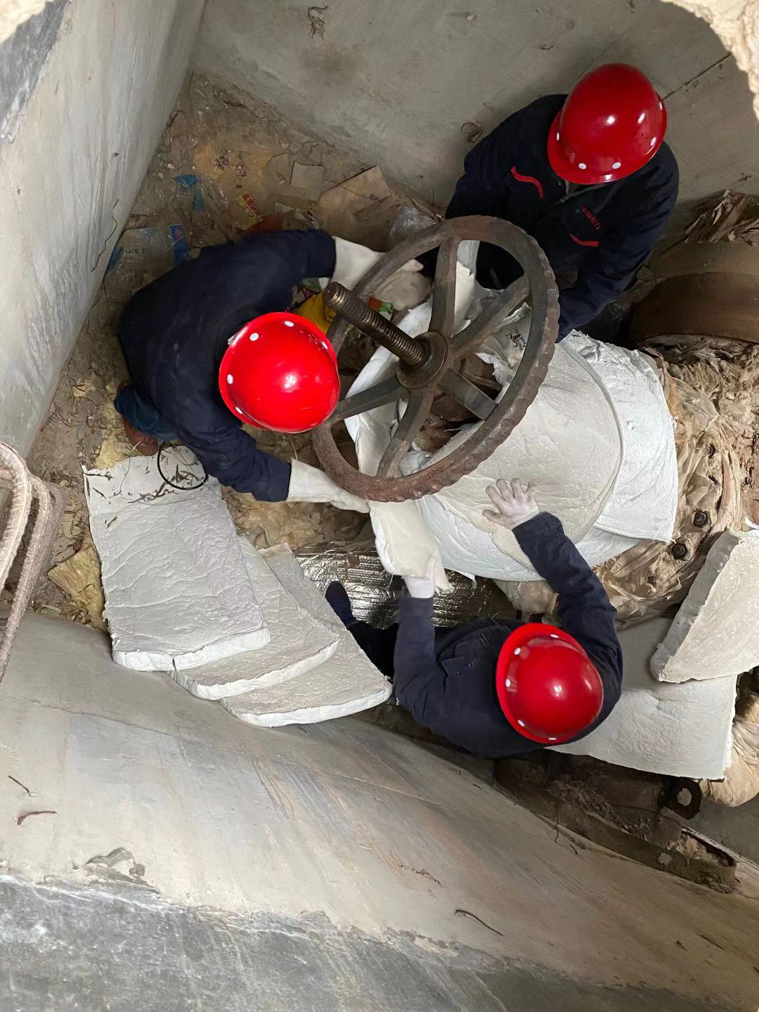 寒冬臘月,井內(nèi)卻熱浪翻滾。井下作業(yè)人員不斷的用小型噴壺噴灑冷水降溫,其余人抓緊時間拆除破舊保溫材料,換上新的巖棉。三班兩倒,五分鐘一換,分工合作,有條不紊。任務(wù)艱巨,條件惡劣,工作不易。盡管如此,所有閥門井的破舊保溫材料還是按照計劃時間全部換新,圓滿完成了保溫修復(fù)任務(wù)。