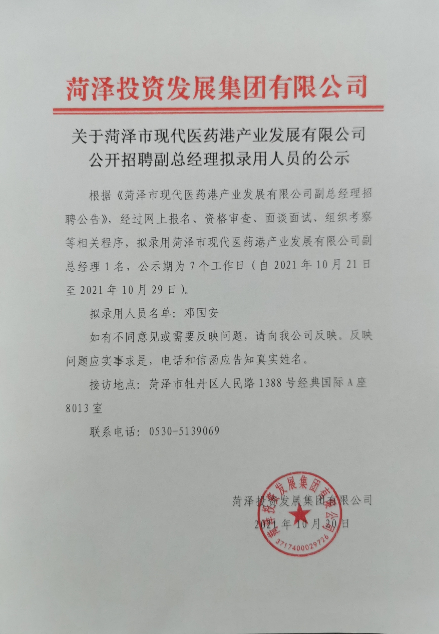 關(guān)于菏澤市現(xiàn)代醫(yī)藥港產(chǎn)業(yè)發(fā)展公司公開招聘副總經(jīng)理擬錄用人員的公示