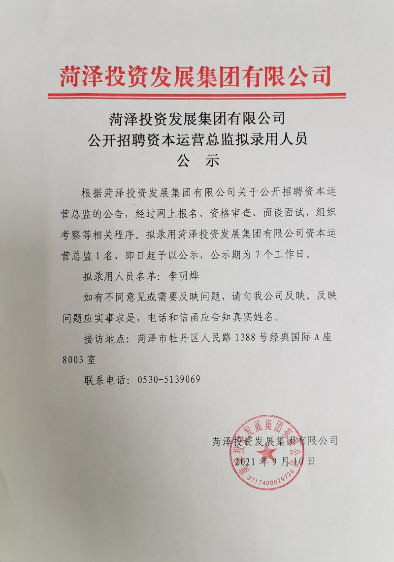 菏澤投資發(fā)展集團(tuán)有限公司公開(kāi)招聘資本運(yùn)營(yíng)總監(jiān)擬錄用人員公示